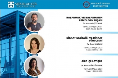 Yahya Kemal Beyatlı Ortaokulu öğrenci ve velilerinin dinleyici olarak yer alacakları etkinlikte, AGÜ Psikoloji bölümü öğretim üyelerinden Dr. Ahmet Çoymak ve Dr. Mehmet Akif Güzel, NNY Psikoloji bölümü öğretim üyelerinden Dr. Esra Kısacık ve Dr. Burcu Ünlütabak konuşmacı olarak yer alacaklardır. Hocalarımız, 24 Mayıs pazartesi ve 28 Mayıs cuma günleri, 19.00-21.00 saatleri arasında dinleyiciler ile buluşacaktır.